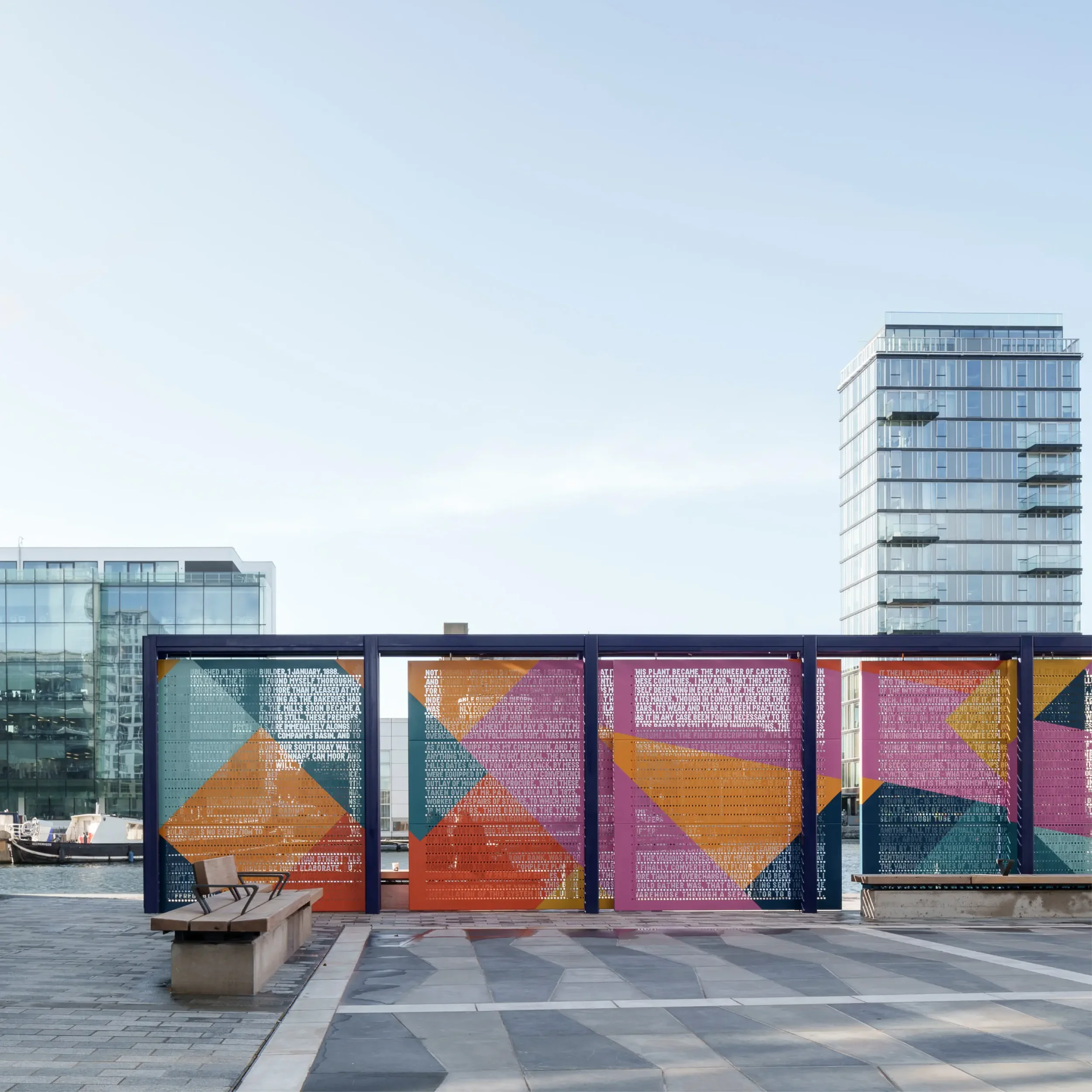Designed in collaboration with Begley Hutton, The screen at Bolands Square fuses graphic artwork from Sean Atmos with perforated text from an original article in ‘The Irish Builder’, describing Bolands Mills over 130 years ago.